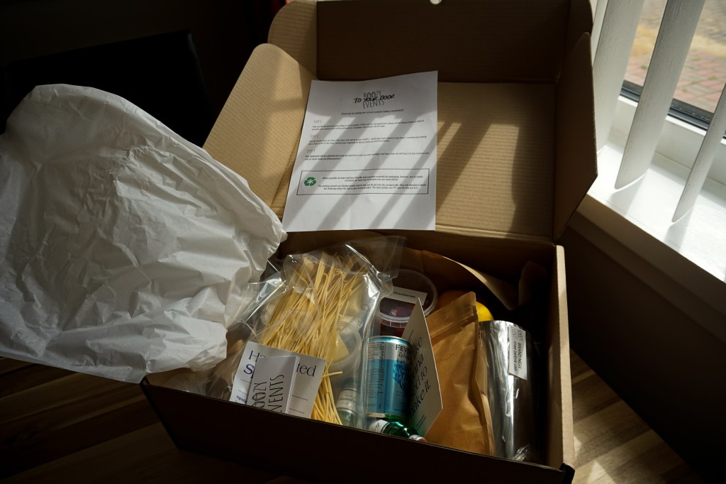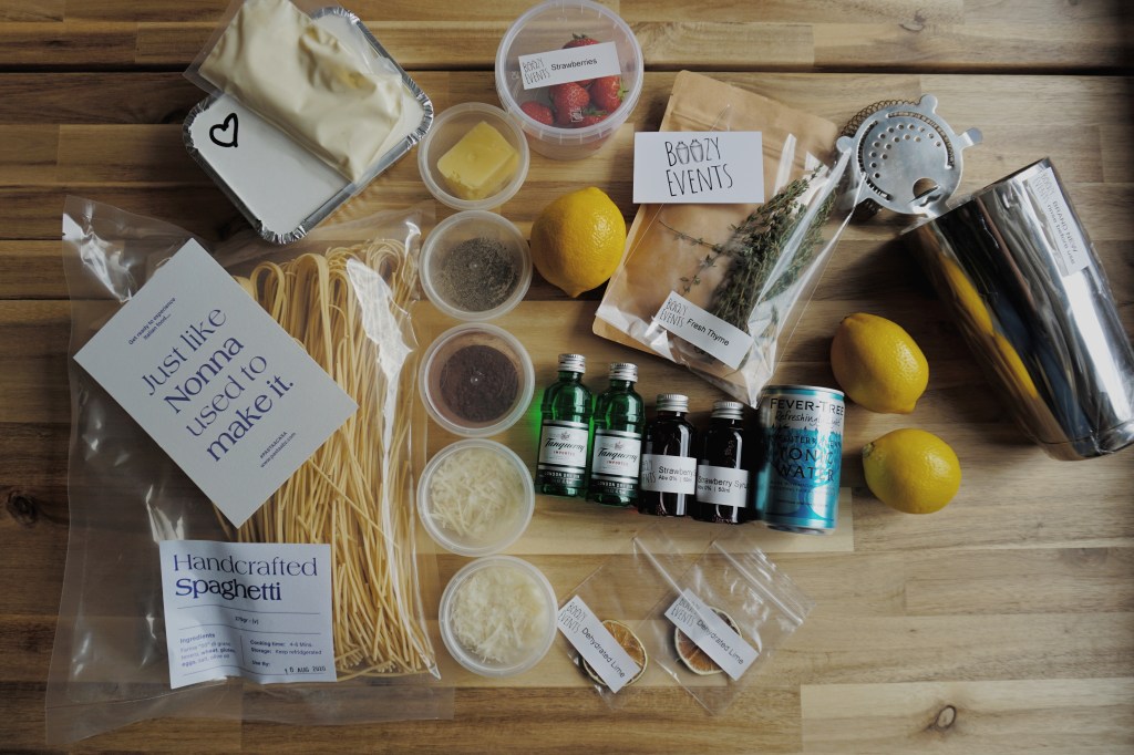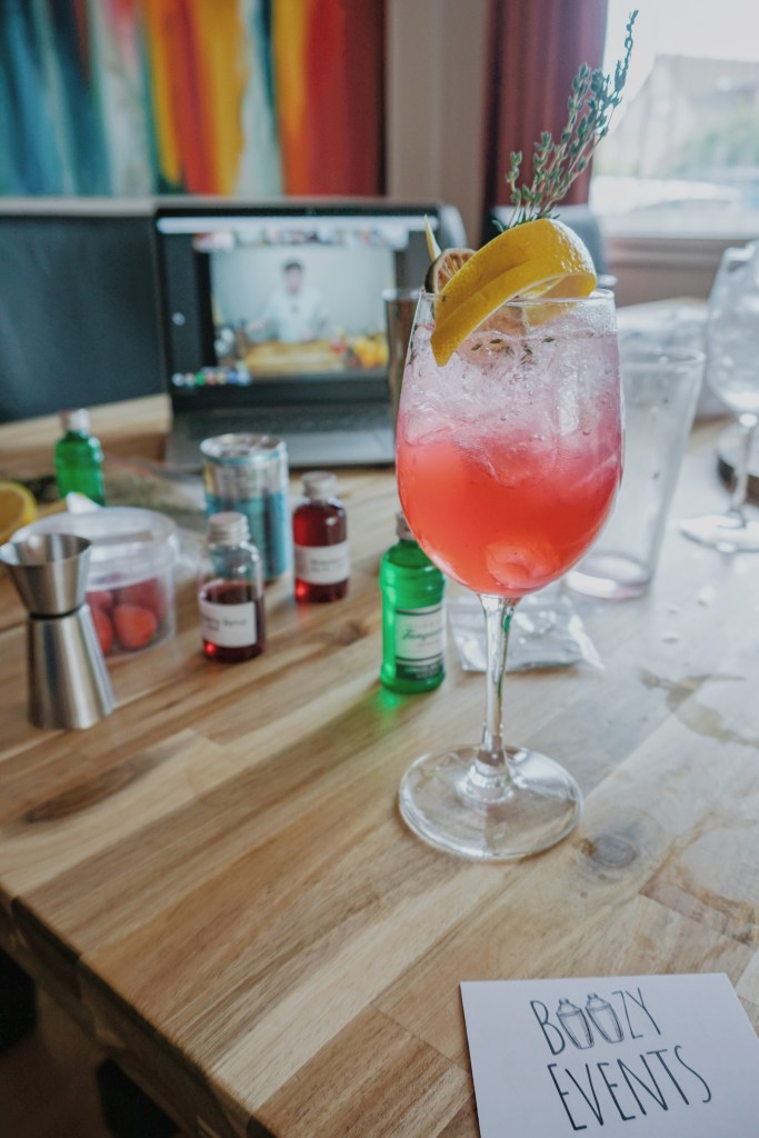 I booked online ahead of time and then all the ingredients were hand delivered to my front door in the afternoon. The evening rolled around and we joined the team and our fellow participants on Zoom to get cracking. We started off by mixing the Summer Thyme cocktail as an aperitif. The cocktail involved gin, strawberry syrup, lemon juice and thyme and it was super refreshing. The tutorial to make this was deftly guided by Boozy Events Founder Cammy who was really clear, informative and fun so you could definitely succeed even if you’ve never held a cocktail shaker before and have a great time!