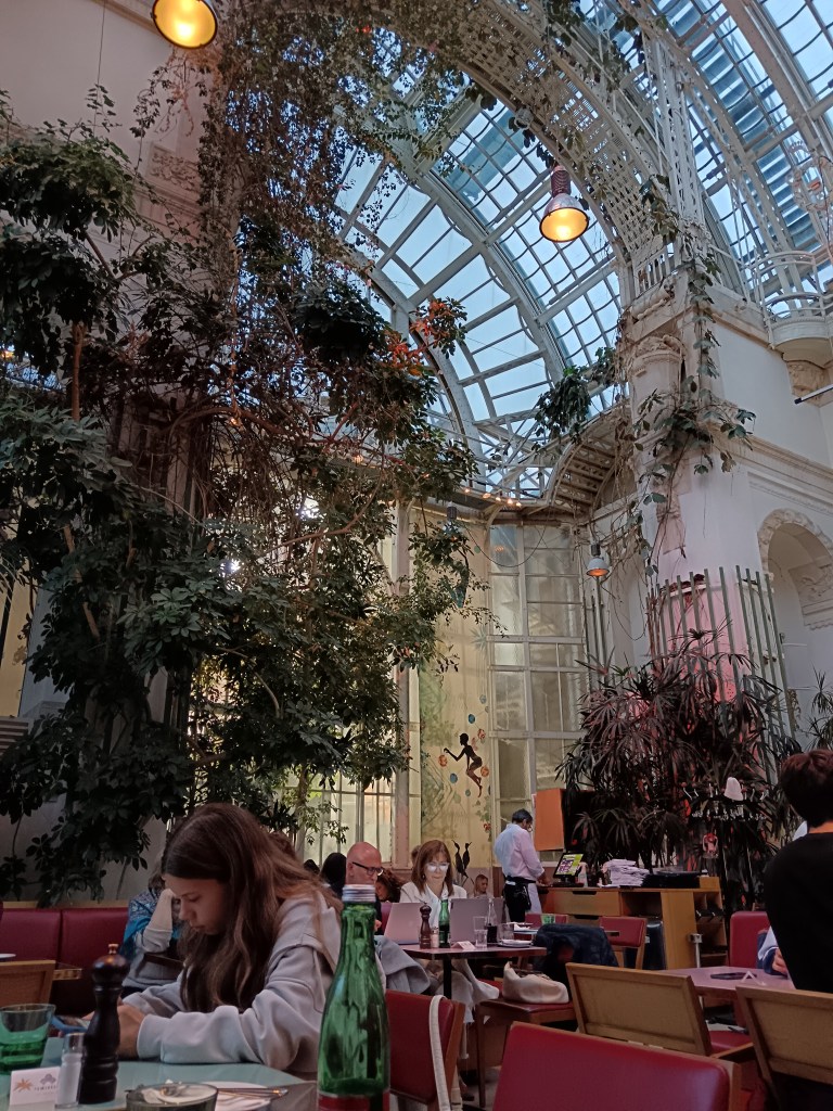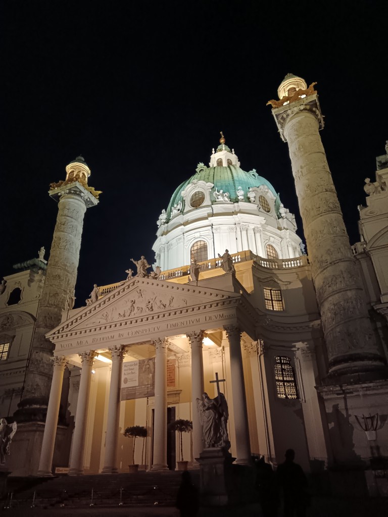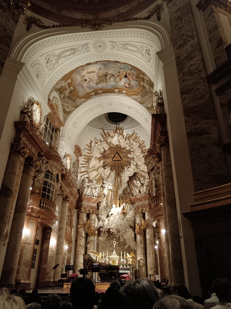 So on the first day, after we arrived in Vienna, we took the train into the city and grabbed some lunch before we could check in. Then we seized the afternoon and went down to the Theatermuseum at the Palais Lobkowitz, where I learned about someone who made schnitzel and strudel costumes. It wasn’t my favourite museum as it talked about a lot of artists and films that I wasn’t familiar with but it was cool to see a concert hall where Mozart and Beethoven had played and a Klimt painting. We then had our dinner in the gorgeous Palmenhaus surrounded by plants which was really lovely. The first evening’s plans were to catch a concert of Vivaldi’s Four Seasons performed in the stunning Karlskirche (as recommended by Letitia) which was so nice. It was a very grand setting to see talented musicians playing iconic music in that epic setting.