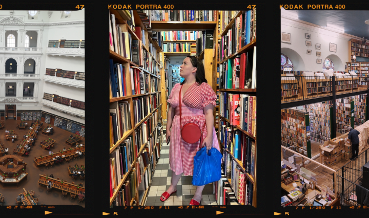 A collage of photos in polaroid frames, a book in front of a lake, me standing by a large bookshelf and the ceiling of a grand library