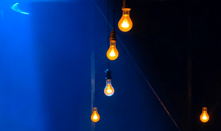 Strings of shiny streamers and lights hang from the ceiling putting an orange glow over the image
